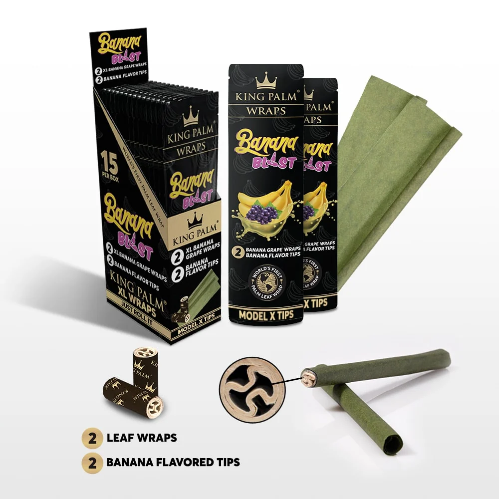 Every pack of King Palm Banana Blast blunt Wraps comes with two model x filter tips. Unlike our pre-rolled leaf cones, we’ve separated the pieces so you can roll your own product. King Palm wants you to have the option to control how you put your palm together. Roll yours thick, roll it thin; it’s up to you! Plus, you have the option to use your hands or a roller machine. Either way, you’ll want to lay the product in Palm’s flavored wrap, insert the Model X paper tip in alignment with the wrap so the edges match up, then roll up nice and tight!